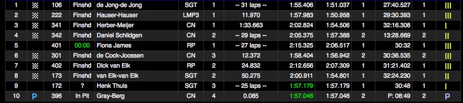 David en Gary Hauser probeerden vanaf de tweede positie wel de nodige druk op De Jong te zetten, maar de Mercedes AMG GT3 van De Jong was de snellere bolide. De Ligier LMP3 bolide van de Luxemburgers kon niet aanhaken bij de leider in de race en zagen hem aan de horizon vertrekken. Op het hoogtepunt was De Jong maar liefst 23 seconden voor op de nummers twee. Aan het einde van de race, toen regenval weer voor de nodige gladheid zorgde, liet De Jong het tempo dalen en kwam uiteindelijk met elf seconden voorsprong over de streep.