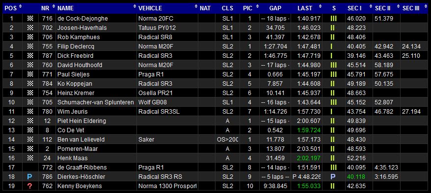 Joosen en Haverhals bleven ruim een halve minuut verwijderd van de overwinnende Norma. De Tatuus coureurs verloren maar liefst 34 seconden op de eerste plek en kwamen als tweede over de meet vóór de radical SR3 van rob Kamphues. Kamphues wist de tweede positie op zeven seconden te benaderen, maar kwam racetijd te kort om het gat helemaal te dichten. De televisiepersoonlijkheid was bijna 3.5 seconde per ronde sneller dan Joossen en Haverhals.