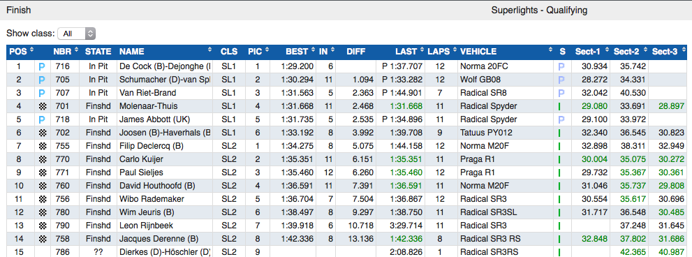 Op de eerste drie plekken was het een mooi divers gezelschap met de Norma op P1, de Wolf van Schumacher en Van Splunteren op de tweede positie en de Radical SR8 van Van Riet en Brand op de derde stek. De snelheidsverschillen waren fors te noemen de snelste tijd was een seconde rapper dan de tweede tijd, terwijl de Radical coureurs op P3 1,3 seconden langer nodig hadden voor hun ronde op het Belgische circuit.