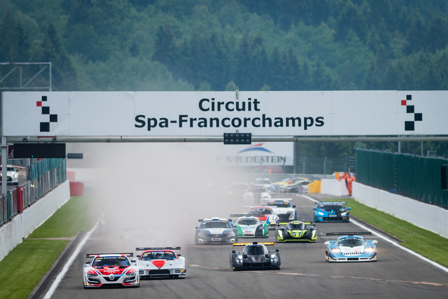 Meteen daarachter kwamen de deelnemers uit de GT-divisies binnen. De regenbanden werden massaal uitgerukt. Zonder noemenswaardige incidenten kon iedereen de baan weer op, die door de regenbui spiegelglad was.