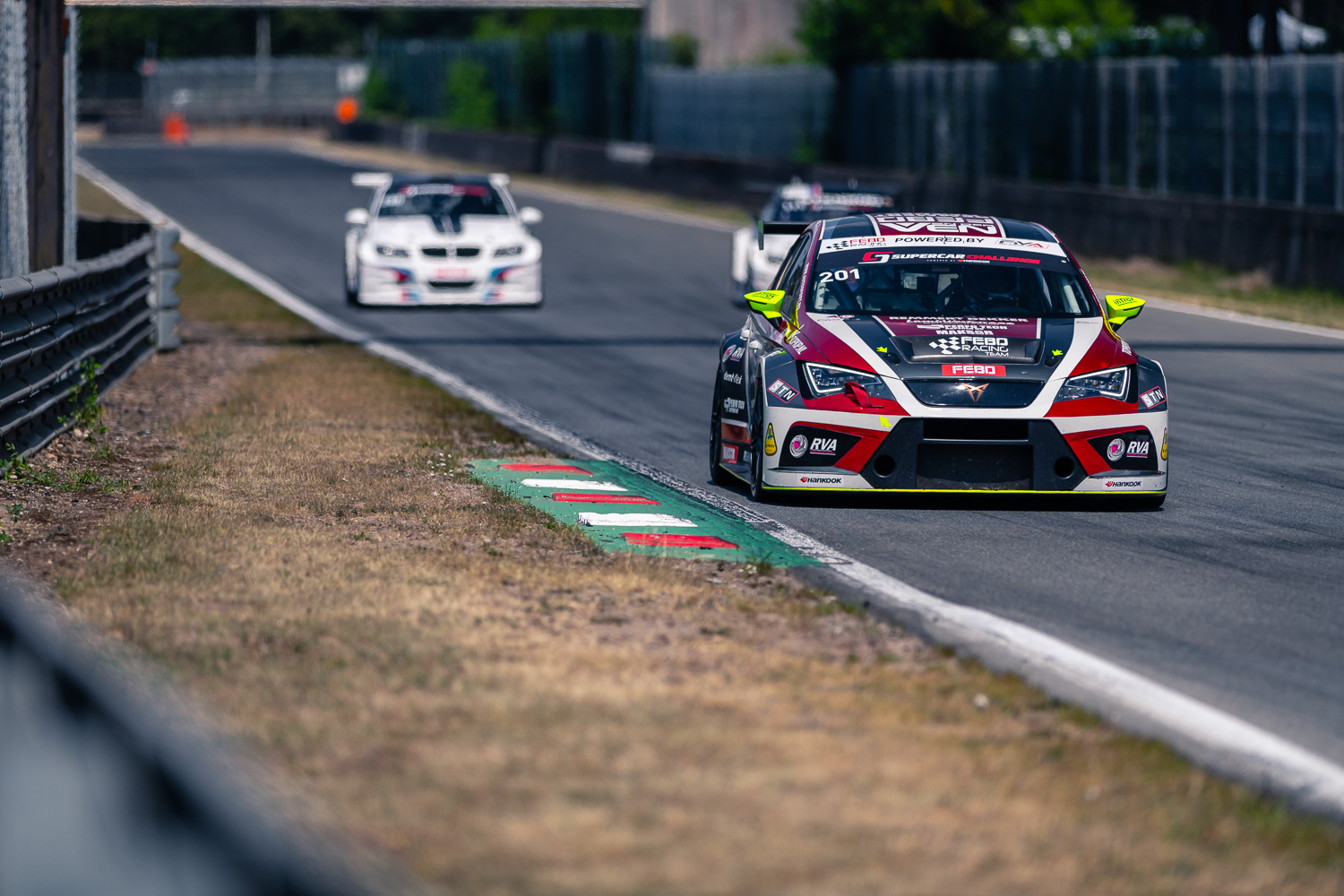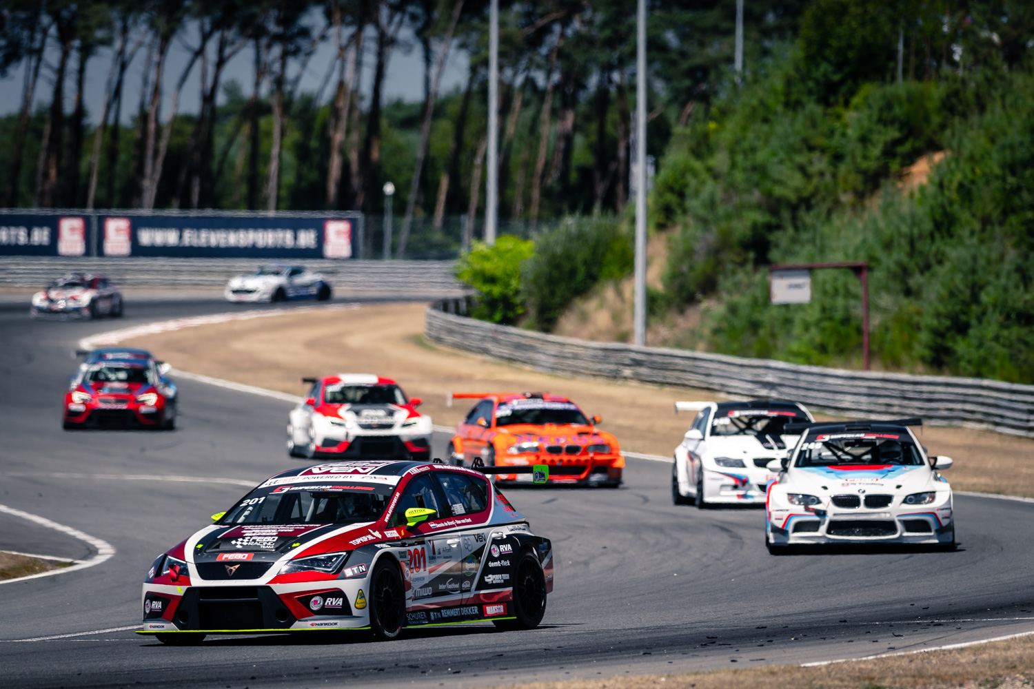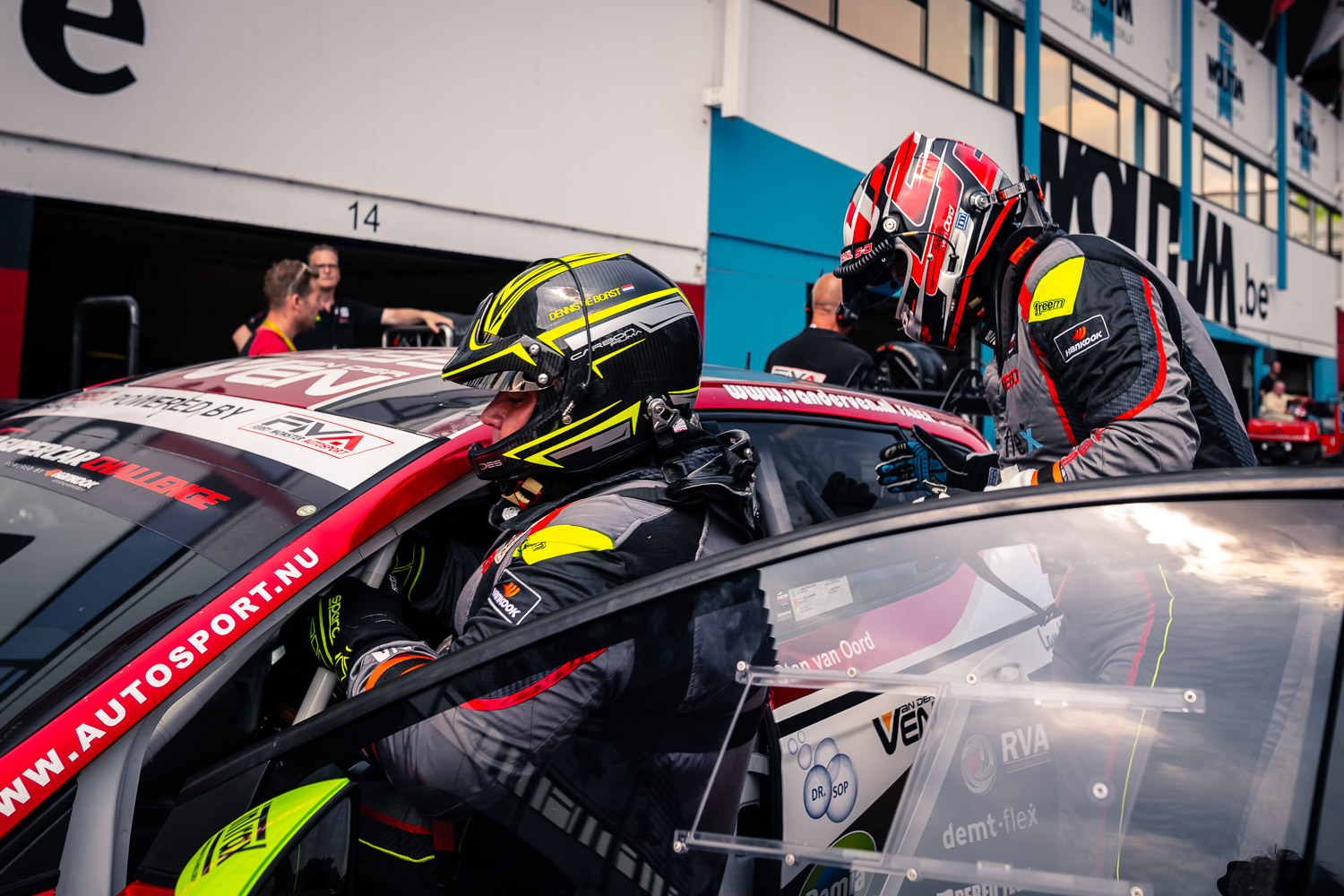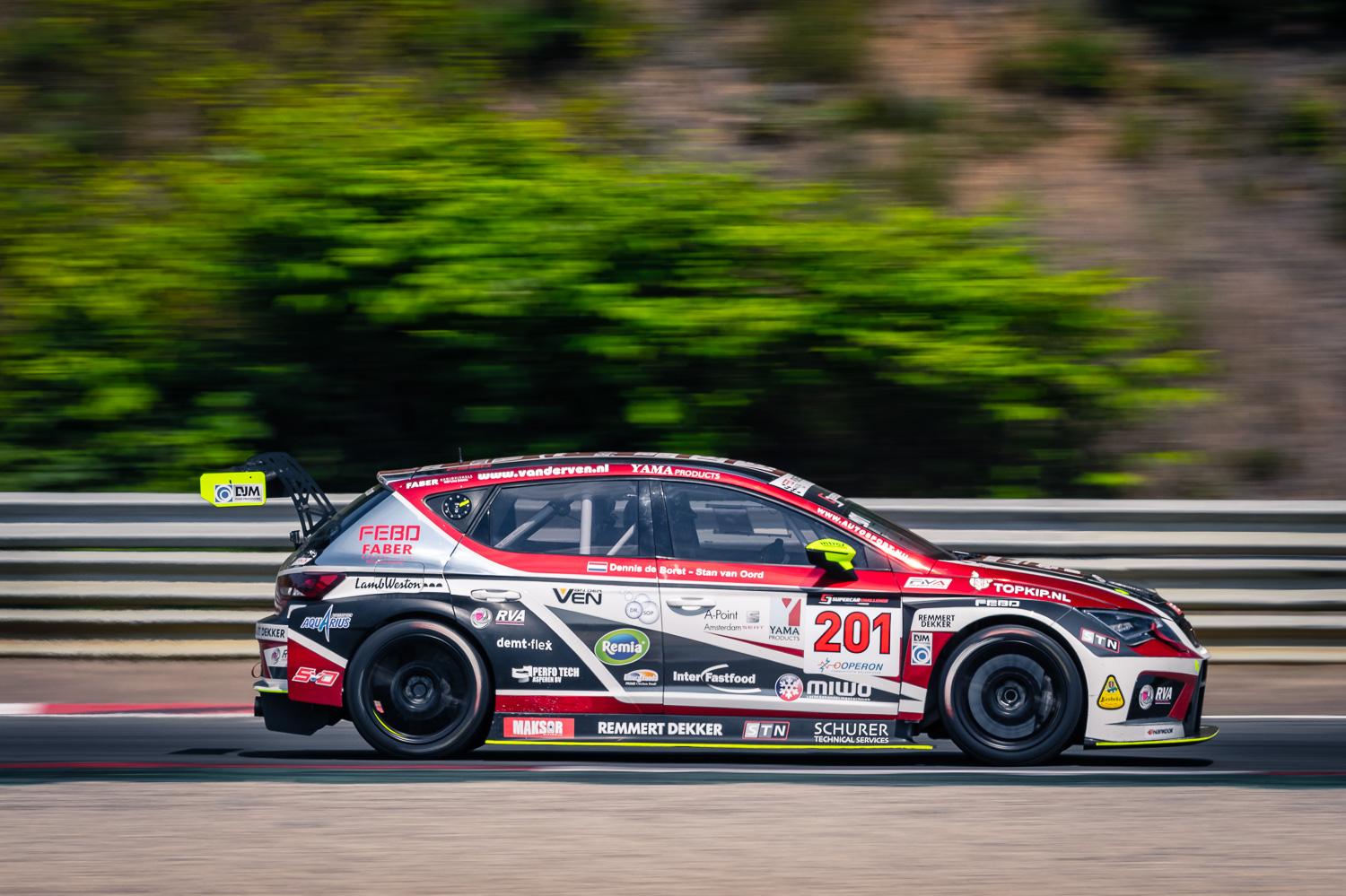 Onder erg warme omstandigheden was het Dennis de Borst die de race startte en na de pitstop voor het tweede deel van de wedstrijd de wagen zou overdragen aan Stan van Oord. De warmte van de buitenlucht én daardoor het asfalt hadden onmiskenbaar invloed op de prestaties van de snelle SEAT. Desondanks wisten de heren nog naar een zeer sterke tweede positie te rijden. Dennis legde uit wat er tijdens de eerste race speelde: “Bij de start kon ik nog prima volgen, maar door de warmte merk je al snel dat de auto het moeilijker krijgt. De banden slijten harder door de hoge asfalttemperatuur en ik wilde ze toch wel redelijk goed zien te houden. Anders had Stan na de pitstop een hele moeilijke race tegemoet gegaan. Zolder is altijd voor onze auto een wat lastiger circuit, dat komt door de voorwielaandrijving die hier in het nadeel is. Maar vandaag, met 30 graden luchttemperatuur, komt daar ook nog bij dat de turbo minder effectief wordt en dus minder vermogen levert.” Het was kortom een lastige race voor de mannen, maar pakte met een eerste podiumklassering dit weekend nog prima uit.