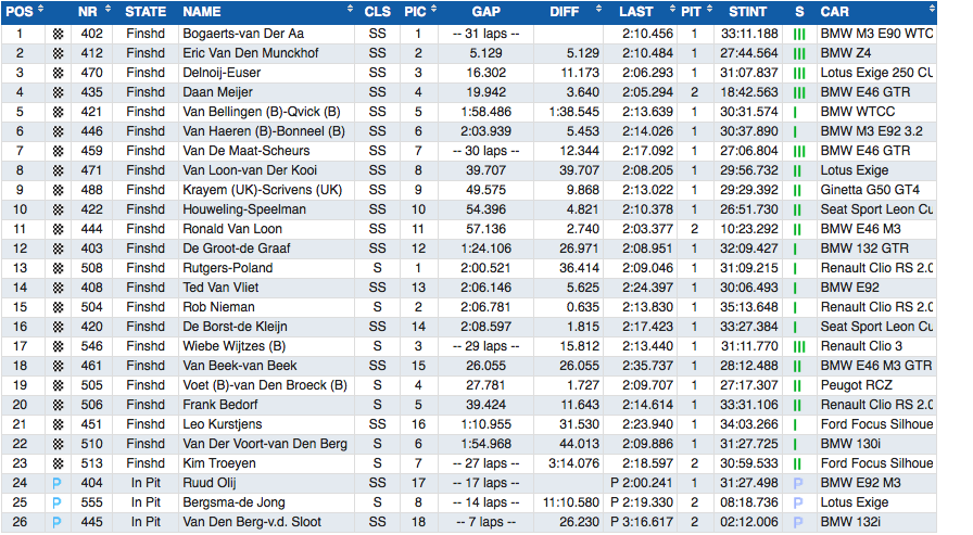 Daan Meijer leidde vanaf de start tot en met een kleine twintig minuten voor het einde van de race. De wedstrijdleiding betrapte de BMW rijder op een te korte pitstop, wat hem op een doorrijstraf kwam te staan. Na het inlossen van die bestraffing lag hij 5.5 seconde achter de nieuwe leider in de vorm van Koen Bogaerts en Mark van der Aa, die eveneens met een BMW strijden.