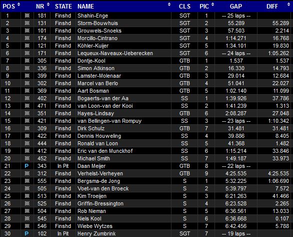 De Sport-divisie werd op naam van Bergsma en De Jong geschreven. De equipe bleef de Peugeot van Voet en Van den Broeck voor, die zelf racende advocate Kim Troeyen achter zich wisten te houden.