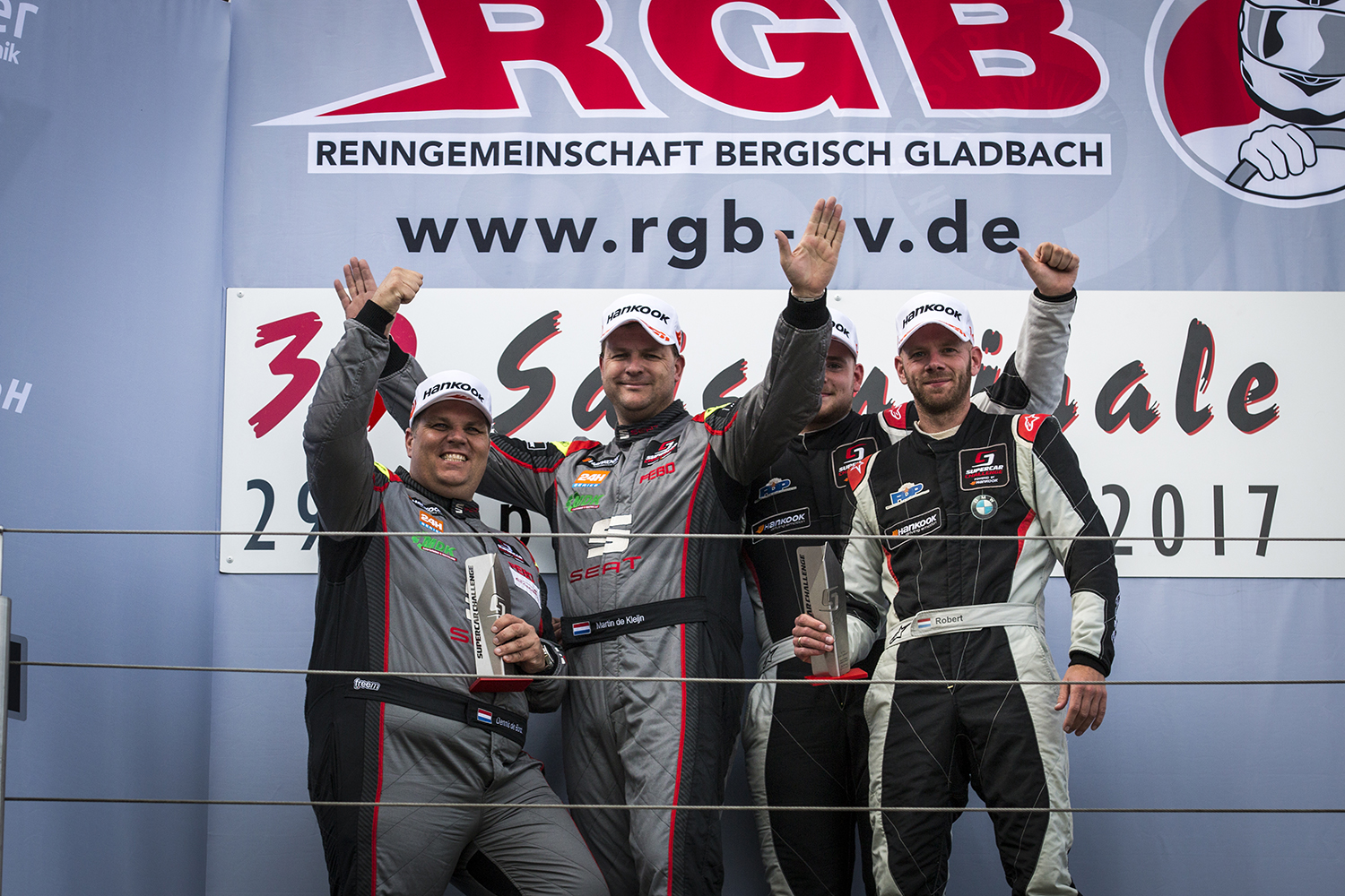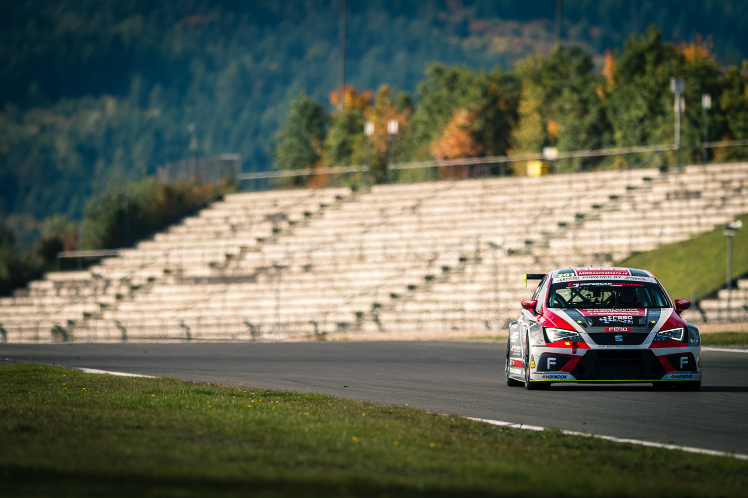 Voor de eerste race van het weekend was de regen nog steeds niet opgehouden en besloot de wedstrijdleiding het veld twee rondes achter de safetycar te laten rijden. Toen het veld werd losgelaten kwam Dennis de Borst als door een wesp gestoken uit de startblokken en pakte niet alleen de leiding in de klasse, maar wist zelfs de derde plek overall te bezetten! Op de gladde baan wist hij weg te lopen bij zijn concurrenten om de titel, alleen een soortgelijke SEAT Leon kon hem volgen. Dennis gaf de leiding over aan de andere SEAT. “Mijn start was gewoon geweldig. Ik heb daarna niet geprobeerd om de andere SEAT achter mij te houden, ik wilde simpelweg geen risico’s lopen met het mogelijke kampioenschap in mijn achterhoofd. Ondanks de lastige omstandigheden en het gebrek aan traction control, wist ik weg te lopen bij onze concurrenten om te titel. De eerste helft van de race ging helemaal zoals gepland.”