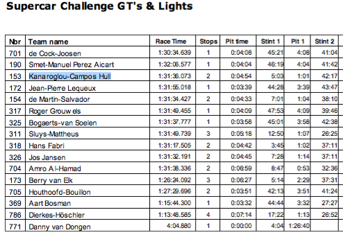 De Renault RS.01 van Smet / Manuel Perez Aicart pakte wel de overwinning in de Super GT-divisie. Voor de Mosler van Kanaroglou / Campos Hull die een extra stop maakten voor slicks.