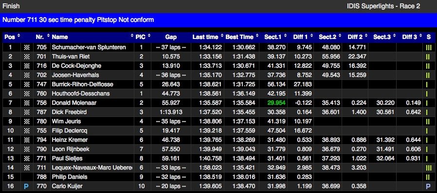 De winnende equipe van de eerste race, Henk Thuis en Pim van Riet, kwamen er vandaag niet aan te pas in het laatste deel van de race. De mannen verloren ruim tien seconden op de leiders, waardoor ze naar de tweede positie konden komen en weer een mooi puntenaantal aan op hun conto kunnen schrijven. De belgische wagen van De Cock en Dejonghe kwam als derde in de snelste groep over de streep. Hun landgenoten Houthoofd en Desschans pakten de overwinning in de tweede groep van deSuperlight divisie en versoegen daarmee Donald Molenaar en Dick Freebird die twee podiumklasseringen pakte in de Superprix.