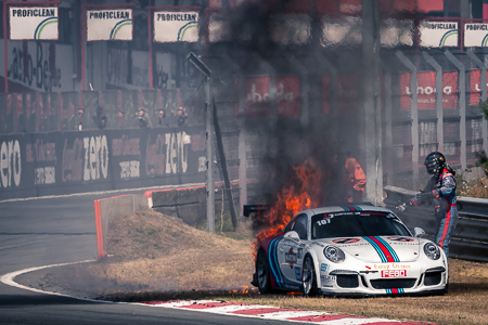 De temperatuur in het Belgische Zolder kwam tot 30 graden, terwijl meer dan 34 bolides oplijnden voor de eerste wedstrijd van het weekend. In de tweede ronde kreeg Daan Meijer te maken met een brand in zijn Porsche. Hij wist gelukkig op tijd zijn wagen te verlaten, maar de schade was groot.