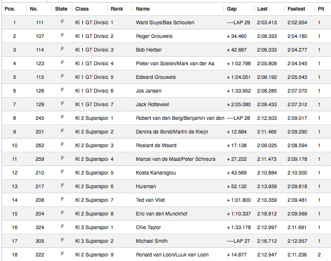 Ward Sluys gaf de leiding uit handen toen hij vroeg de BMW de pitstraat in stuurde, om de wagen over te geven aan Bas Schouten. Een goede tactische zet van het duo, die hen uiteindelijk een ruime overwinning zou opleveren. Schouten zette geweldige tijden op de klok en was veruit de snelste van het veld. Toen ook Grouwels zijn stop had gemaakt, was de voorsprong van het duo Sluys/Schouten aanzienlijk. Voor de Limburger zat er niets anders op om voor de tweede stek te gaan, want de leiders waren buiten het bereik van de Porsche rijder. Op de derde stek in de GT-divisie was het Bob Herber.