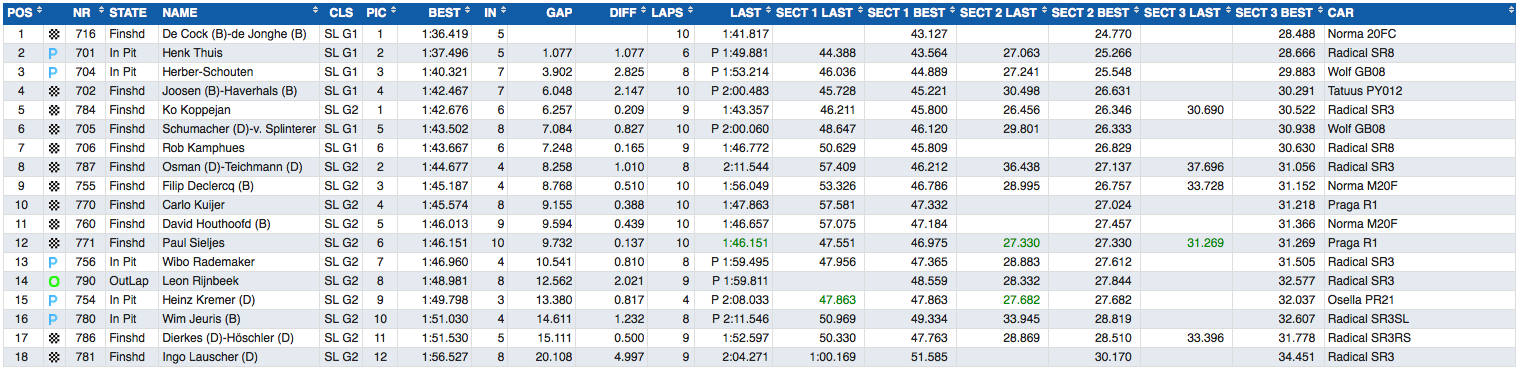Radical SR8 coureur Henk Thuis wilde zich echter niet zonder slag of stoot gewonnen geven, hij verbeterde zijn tijd danig. De nestor sprong van twee seconden achterstand naar één seconde achterstand en bleef daarmee op de tweede positie hangen. De Radical die de eerste startrij op dat moment bezette dook na zijn uiterst snelle rondjes de pits in en zat daar de rest van de sessie rustig af te wachten of de overige deelnemers nog met een antwoord zouden komen. Thuis maakte een goede keuze door binnen te blijven, hij spaarde zijn banden en niemand kon zijn tijd nog aanvallen.