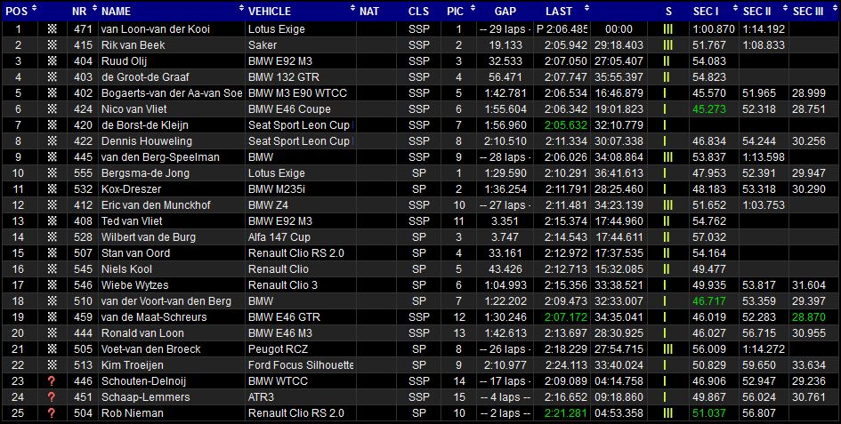 Op het glibberige natte asfalt was het de equipe Van Loon / Van der Kooi die het beste uit de verf kwam, ze versloegen Rik van Beek in de Saker. De Saker coureur wist de tweede positie wel vast te houden, maar liep wel meer dan een kwart minuut achterstand op ten opzichte van de rappe Lotus Exige. Een halve minuut na de leider kwam Ruud Olij als derde man over de eindstreep. De BMW rijder reed weer een prima race en rondde het seizoen af met een mooie podiumklassering.