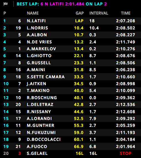 Latifi begon van pole en wist deze dan ook te verzilveren. Nyck de Vries op de tweede stek kon aanvankelijk het tempo volgen, maar zag langzaam de Canadees aan de horizon verdwijnen. De Nederlander had veel van zijn banden gevergd en zal in de slotfase op het rechte stuk zowel Lando Norris als Alexander Albon aan hem voorbijkomen. De Vries pakte nog wel de vierde stek.