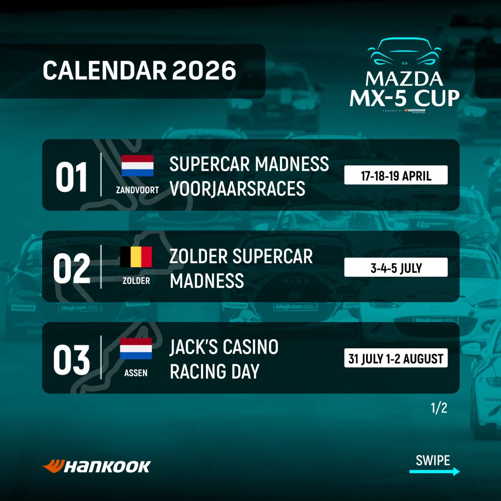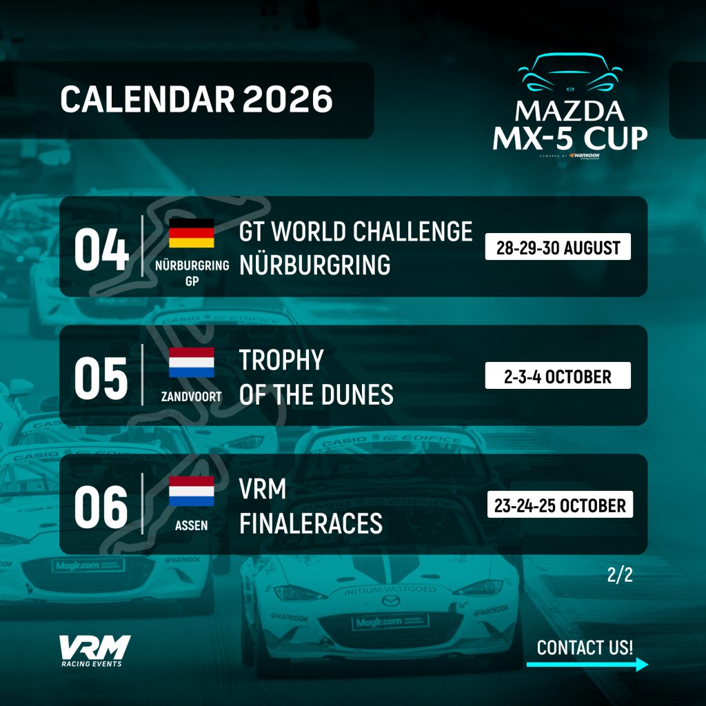 Enkele dagen na het vallen van de vlag voor de laatste wedstrijden van de Mazda MX-5 Cup heeft de organisator V-Max Racing Events de nieuwe kalender gepresenteerd. De spectaculaire klasse zal actief zijn in de Benelux, maar daarnaast ook uitkomen op de Nürburgring tijdens het GT World Challenge evenement. Hiermee is er een mooie en evenwichtige kalender samengesteld.