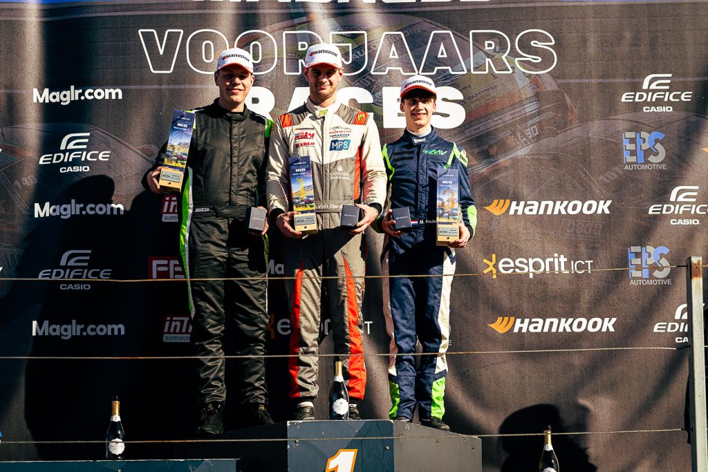 De derde en laatste race van de Mazda MX-5 Cup tijdens de Voorjaarsraces eindigde in een bloedstollende apotheose. Marcel Dekker, jarig op deze racedag, greep al vroeg de leiding en leek lange tijd op weg naar de overwinning. Jordy van der Eijk beet zich vast in de bumper van Dekker en gunde hem moment rust en sloeg in de laatste meters toe, waarmee hij de zege pakte.