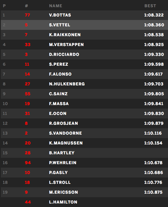 Het leek er in de slotfase op dat Sebastian Vettel zijn vijftigste poleposition zou pakken, maar de Duitse Ferraricoureur werd met 0,038 seconden afgetroefd door Bottas. Voor Kimi Räikkönen was het een prima kwalificatiesessie, het leverde hem de derde startplek op.