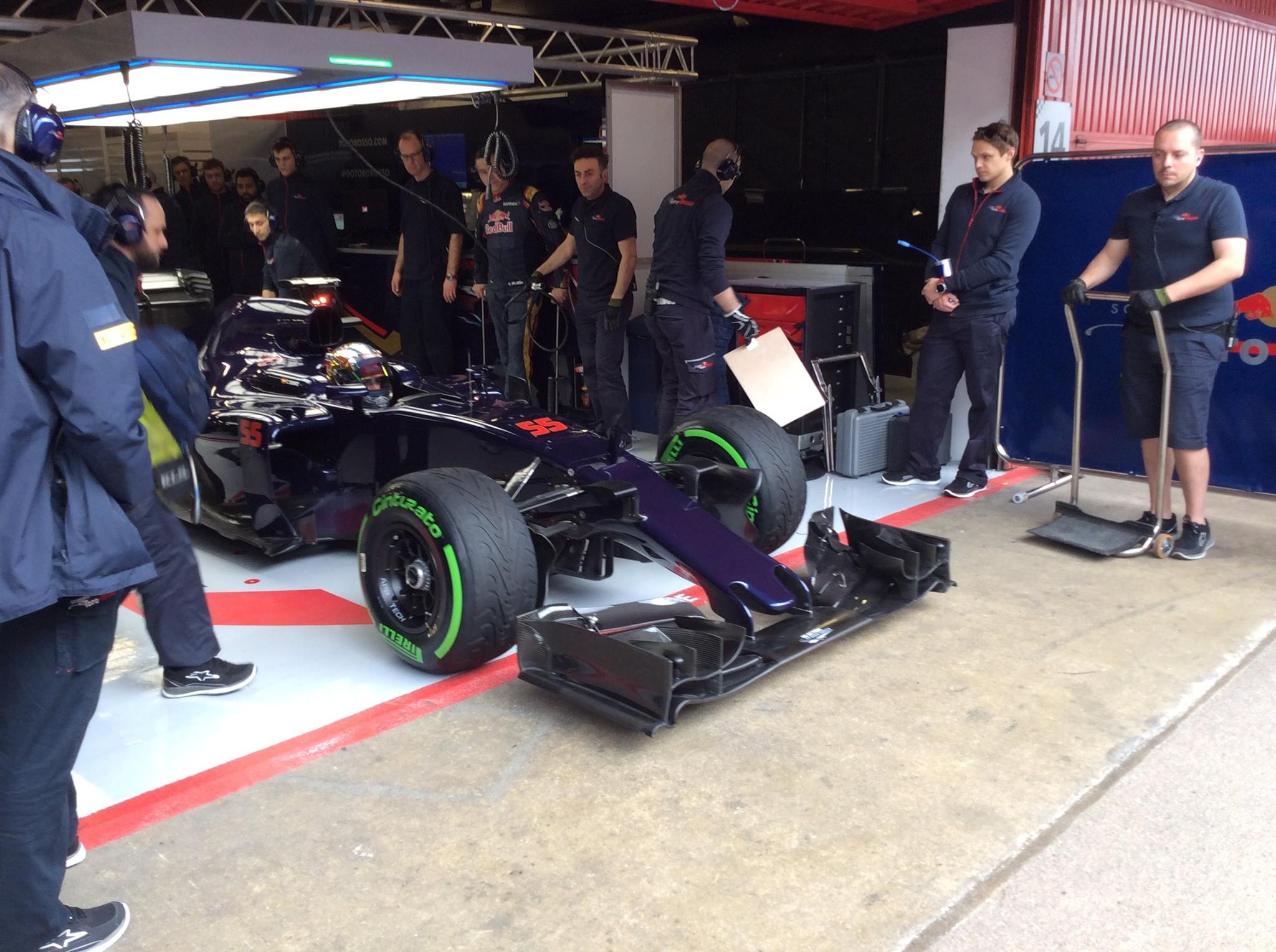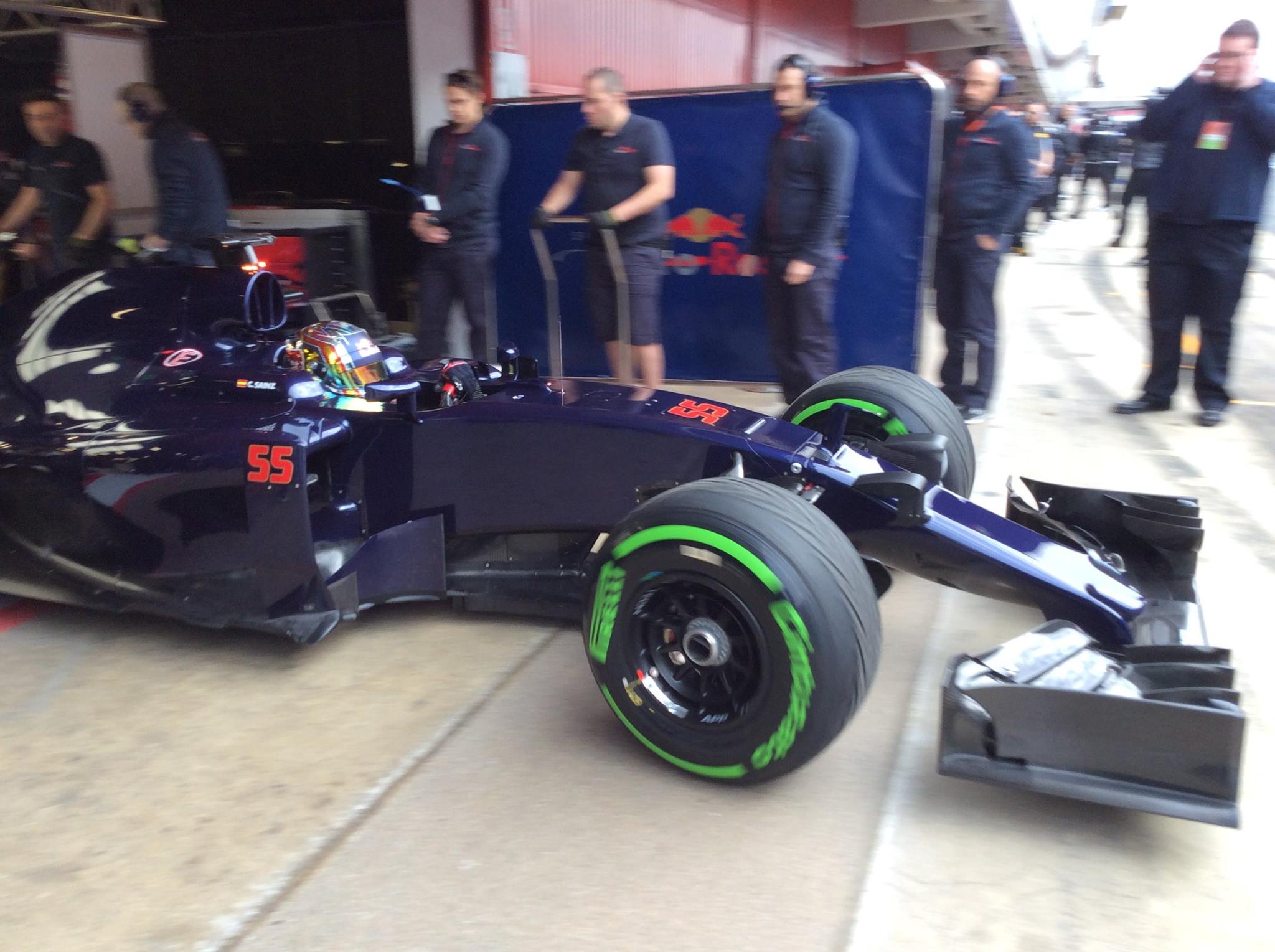 Toro Rosso rijdt de eerste test op Barcelona met een sponsorloze bolide. Carlos Sainz rijdt de eerste meters met de nieuwe Italiaanse bolide, die in het stemmig blauw is uitgevoerd. Dinsdag is het de beurt aan Max Verstappen om met de wagen het circuit op te gaan.