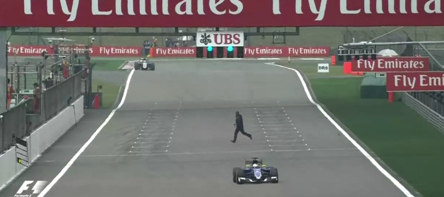 Een van de toeschouwers op het Sjanghai International Circuit in China is aangehouden nadat hij het rechte stuk overstak tussen twee Formule 1 wagens door. De man klom over een hek en rende de baan over om aan de andere kant door een gat in het hek de pitmuur in te springen.