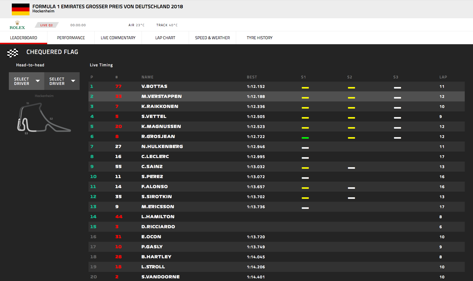 Nadat de baan weer was vrijgegeven ging Verstappen op paarse ultra zachte banden op pad en klokte een tijd die een fractie langzamer was dan de snelste tijd van Bottas. Verstappen verloor 0,036 seconde op de Finse Mercedescoureur. Räikkönen sloot op P3 achter hem aan op iets meer dan 0,1 seconde en troefte wederom zijn teamgenoot af die op P4 eindigde in Q2.