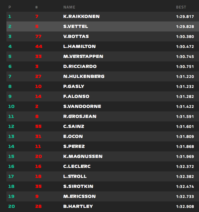 Na afloop van de tweede vrije training is duidelijk dat de beide Ferrari coureurs goed op stoom zijn voor de race van dit weekend in Bahrein. Kimi Räikkönen versloeg zijn teamgenoot met een marge van 0,011 seconden. De twee Mercedessen moesten op de derde en vierde plaats aansluiten met Bottas als aanvoerder van het Duitse merk.