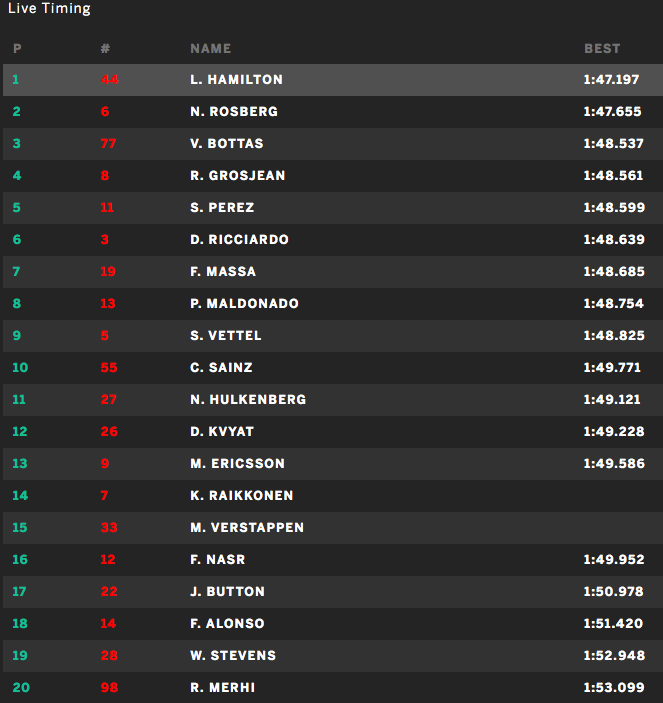 Gedurende de tijdtrainingen van de middag werden de tijden van de ochtend nog eens fors aangescherpt met een seconde of twee. Aan de kop van het veld werden tijden genoteerd die in de 1:47 lagen. Valtteri Bottas was in Q3 na de Mercedessen de beste, hij veroverde de derde startplek op 1.088 seconden achter Hamilton en moest aansluiten achter Rosberg die nog tot 0.458 seconden van Hamilton wist te komen in de seconden na het vallen van de vlag.