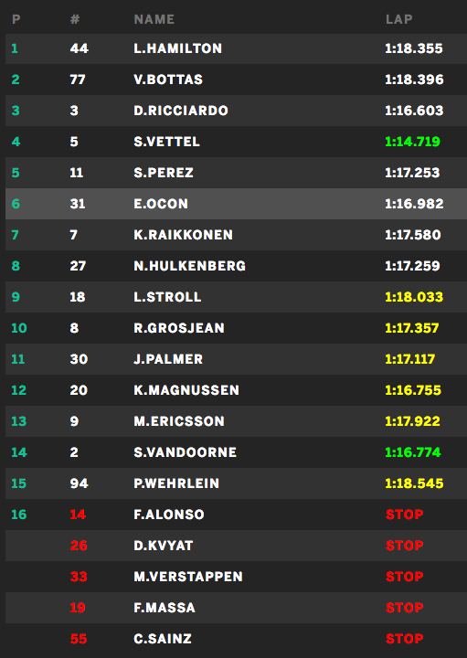 In rondje 66 zette Ocon de aanval in op Perez, maar slaagde niet in zijn opzet. Vettel, die aan de vleugel van Ocon kleefde, profiteerde van het doorschieten van de Fransman en pikte de vijfde positie die hij een aantal kilometer later nog verruilde voor de vierde positie.