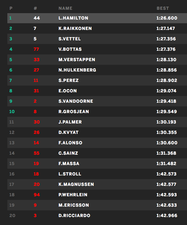 Räikkönen gaf meer dan een halve seconde toe op de razendsnelle thuisrijder, maar was daarmee wel goed voor de tweede positie op 0,2 seconde voor zijn teamgenoot Sebastian Vettel. Valtteri Bottas noteerde met de tweede Mercedes de vierde positie, maar zal op de startopstelling vijf posities teruggezet worden vanwege een versnellingsbakwissel. Hetzelfde lot is Daniel Ricciardo beschoren.