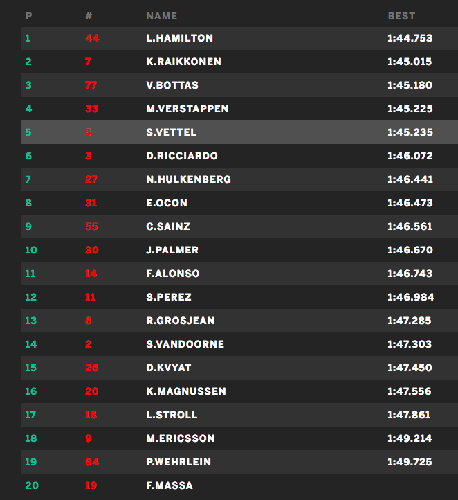Nadat de regen zijn rol opeiste en de baan volledig nat was konden de tijden uiteraard niet meer verder worden aangescherpt. Het bleek zelfs zo nat te zijn dat de mannen na een verkenninsgrondje terug naar het team reden met de mededeling dat de baan zo nat was dat er niet te rijden was. Opvallend was echter dat alle coureurs die het probeerden uitsluitend de intermediate banden probeerden en de full wets lieten liggen.