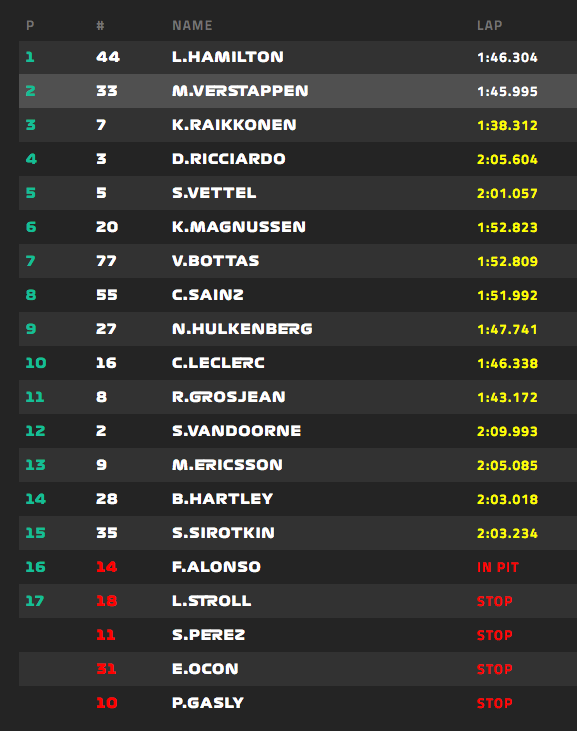 Nadat vettel voor een nieuwe neus bij zijn team was geweest en Bottas een nieuwe band had opgehaald konden de twee achteraan aansluiten en proberen er het beste van te maken. Max Verstappen moest een flink ontwijkende actie ondernemen om de problemen van Vettel en Bottas te ontlopen, maar slaagde daarin dankzij de grote uitloopstroken op Paul Ricard. De Nederlander schoof twee plekken door naar voren naar P2 met Carlos Sainz achter zich op P3. De twee voormalig teamgenoten volgden de leidende Hamilton, al kon de Spanjaard niet lang genieten van zijn top drie klassering. Enkele ronden later was het eerste Ricciardo en korte tijd later Räikkönen die hem voorbij staken.