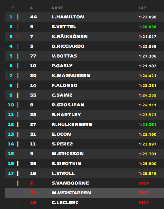 Foutloze pitstops van de topteams zorgen ervoor dat na de bandenwissels Hamilton en Bottas weer terug op de eerste twee plekken kwamen. Daarachter waren het Vettel en Räikkönen die onderling van positie wisselden. Vooraf werd verwacht dat de Ferrari’s het beter zouden doen onder de warme omstandigheden van de Hongaarse zomer. Verrassend genoeg was het echter Mercedes dat de sterkste bleek te zijn.