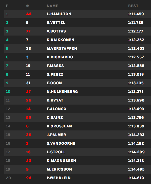 Sebastian Vettel kwam er in de slotfase erg dichtbij, maar zag een verschil van 0,002 seconde achterstand op de tijdwaarneming staan. Voor zijn allerlaatste run ging de Duitser nog eens stevig in cockpit van zin Ferrari zitten, maar kon Hamilton er niet van weerhouden om de snelste tijd te zetten. Hamilton verbeterde zijn eigen tijd met 0,3 seconde en zette Vettel daarmee op achterstand.