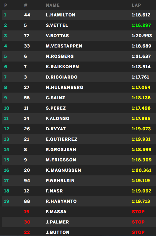 Hamilton kon eveneens zijn positie niet vast houden, de Engelsman werd rap ingehaald door Sebastain Vettel die een razendsnelle start had en de leiding in handen nam, gevolgd door Hamilton. Ook Verstappen wist uitstekend uit de startblokken te komen, hij kwam van P5 na enkele honderden meters naar P3 door de juiste kant te kiezen. Veruit het grootste deel van de race lag de Nederlander op de derde positie, maar moest die opgeven op het moment dat hij voor de laatste pitstop naar binnen ging. Hij viel terug tot de vijfde positie, maar noteerde twee ronden later wel direct de snelste rondetijd.