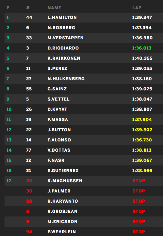 Na 52 ronden werd Hamilton als overwinnaar afgevlagd, Nico Rosberg kwam als tweede over de streep en Max Verstappen noteerde zijn allereerste derde positie in de Formule 1.