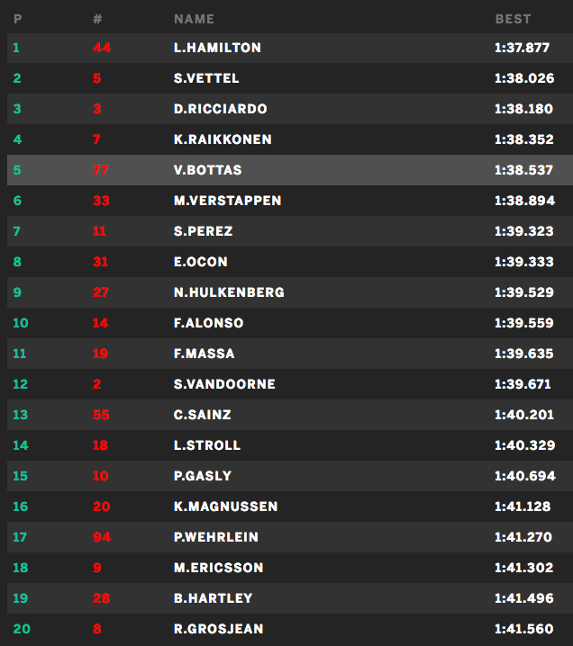 Vettel was in de ochtenduren nog lijstaanvoerder, maar had in de middag geen antwoord op de snelheid van Hamilton. De Ferraricoureur bleef op een 1:38.026 steken en ging daarmee eveneens onder het oude baanrecord. ’s Ochtends had Daniel Ricciardo een moeizame sessie gehad, maar maakte dat in de middag goed door de derde tijd te klokken en daarmee zijn teamgenoot flink wat sneller af te zijn. Verstappen zette eerder de derde tijd, maar moest in de middag genoegen nemen met een P6 op ruim 0,7 seconden achterstand op de Australiër. Voor het Red Bull team is er nog flink wat werk te verzetten voordat de laatste vrije training op zaterdagochtend wordt verreden. Met de wagen van Verstappen kan nog flink wat winst worden geboekt, hij bleef een ruime seconde achter op de snelste tijd, terwijl Ricciardo slechts 0,3 seconde toegaf.