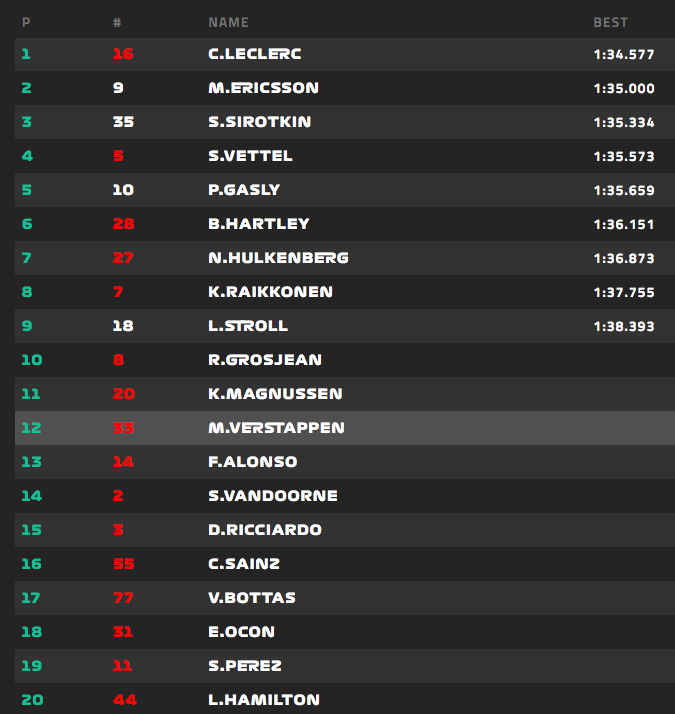 Sergey Sirotkin had de snelste tijd in handen en leek zichzelf onsterfelijk te gaan maken door zijn Williams op P1 te zetten, maar zag in de slotseconden Marcus Ericsson (Sauber) en Charles Leclerc (Sauber) voorbij komen. Van de grote namen zette alleen Sebastian Vettel een serieuze tijd, meer dan de vierde plek wist de Ferrari coureur echter niet te behalen. Kimi Räikkönen probeerde het ook, maar bleef op P8 steken.