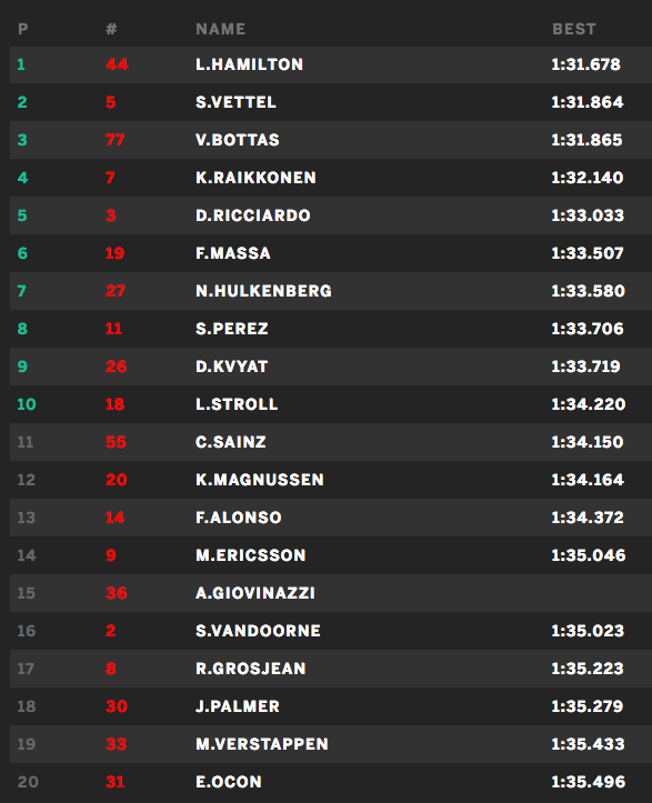 Daniel Ricciardo verdedigde de eer van red Bull Racing nadat Verstappen in het eerste kwalificatiedeel de strijd al moest staken met een technisch probleem. Ricciardo zat er redelijk goed bij, hij zal de race morgen vanaf de vijfde positie beginnen en versloeg de sterk ogende Williams bolides. Felipe Massa, de kopman van Williams, begint morgen als zesde aan de wedstrijd die naar alle waarschijnlijkheid op een natte baan van start zal gaan.