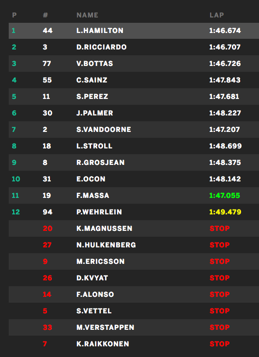 Nadat de safetycarfase werd opgeheven kon Hamilton met vrij zicht naar voren aan een voorsprong gaan bouwen. Voor Daniel Ricciardo was het wederom een degelijke wedstrijd die hem de tweede positie opleverde. In de chaos van de start wist ook Nico Hülkenberg uitstekende zaken te doen, de Duitser reed in de openingsfase op podiumkoers met een derde positie, maar raakte die plek in de loop van de race kwijt en blijft daarmee recorchouder in het aantal GP-starts zonder een odiumfinish op zijn naam te zetten.