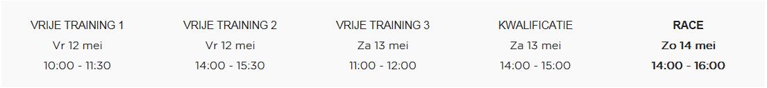 Barcelona ligt in dezelfde tijdzone als Amsterdam, dus de trainingen zijn vrijdag om 10.00 uur en om 14.00 uur. Op zaterdagmorgen is de derde en laatste vrije training om 11.00 uur. Om 14.00 uur gaat het er echt om in de kwalificatie. Op zondag is het dan eindelijk zover, om 14.00 uur doven de lichten en gaan de toeren omhoog!