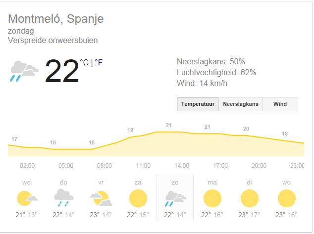 Doorgaans is het Spaanse weer mooi en ’s zomers, regenbuien komen zelden voor tijdens de GP. Dit jaar kan dat echter zomaar anders zijn. Deze week is het grotendeels licht bewolkt geweest, afgewisseld met af en toe regen en andere dagen volop zon en 23 graden. Zaterdag lijkt er bestendig zomerweer in de lucht te zitten, maar zondag… Rond de klok van 14.00 uur lijkt er nattigheid uit de lucht te gaan vallen!