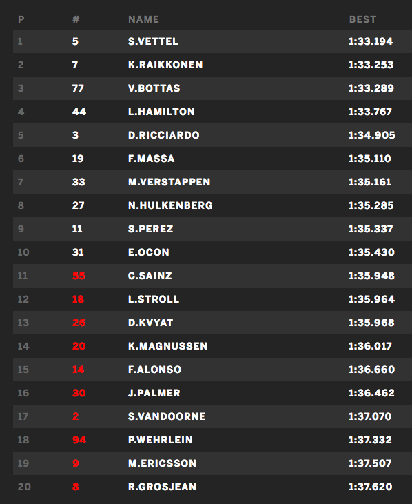 Terwijl teamgenoot Kimi Räikkönen vrijwel de hele kwalificatie de bovenliggende partij leek, wist Sebastian Vettel het meeste uit de ultieme kwalificatieronde te halen. De Duitser klokte in de slotseconden van de laatste kwalificatiesessie een tijd van 1:33.194.