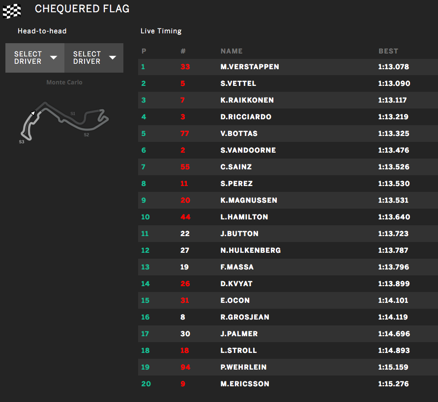 In het eerste deel van de kwalificatie voor de Grand Prix van Monaco heeft Max Verstappen de allerbeste tijd neergezet. Met 1:13.078 was de Nederlander Ferrari coureur Sebastian Vettel met 0,012 seconde te snel af.