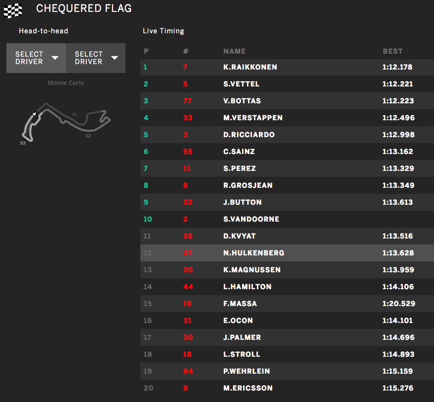 Met de 1:12.178 van vandaag snoert Räikkönen de mond van vele criticasters en pakt voor de eerste maal sinds de Franse GP van 2008 weer een poleposition. Hij versloeg zijn teamgenoot in een direct gevecht om de duizendsten van een seconde. Vettel bleef 0,043 seconde verwijderd van de beste tijd en zette op zijn beurt Bottas op 0,002 seconde achterstand. Verstappen kon zijn top drie klasseringen uit de eerste twee kwalificatiesessies niet herhalen, maar deed het met een vierde positie uitstekend.