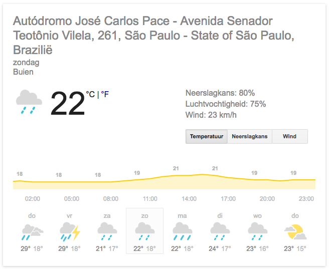 Of Ricciardo de Nederlander in Brazilië kan helpen valt te bezien. Verstappen is een uitmuntende coureur op een natte baan en kan wellicht zonder de helpende hand van anderen ook voor een podiumklassering gaan. Zelf meent Verstappen dat een regenrace hem zelfs een kans kan bieden op de overwinning…