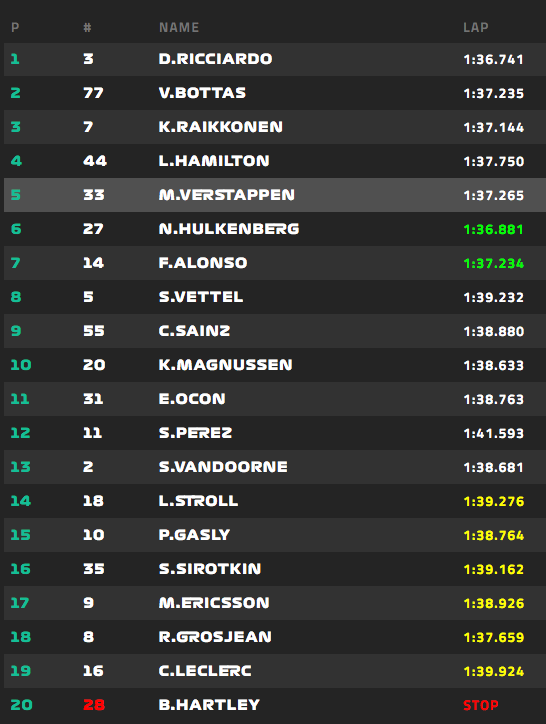 Verstappen probeerde Hamilton aanvankelijk te verschalken, maar moest eieren voor zijn geld kiezen en de baan verlaten. De twee strijders van de vorige race kwamen elkaar hier wederom stevig tegen. Nadat de Nederlander flink wat meters verloor na deze mislukte actie kon hij opnieuw de aansluiting vinden bij de Engelsman en pakte hem alsnog. Een inhaalpoging daarna op Vettel liep helemaal mis, waarbij de twee elkaar raakten en spinden. Verstappen werd door de wedstrijdleiding aangewezen als aanstichter en kreeg hiervoor tien seconden straf. Alsnog knokte de Nederlander zich terug naar de vierde positie, maar na de straftijd viel hij terug naar de vijfde plek.