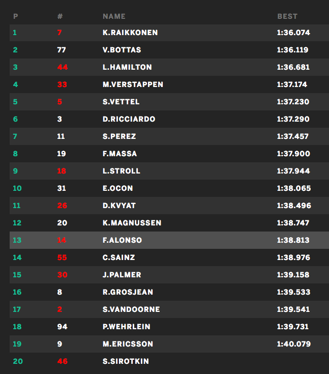 Voor Sergey Sirotkin was de sessie snel afgelopen, zijn Renault gaf de geest kort na het uitrijden van de pitsstraat, waardoor een gele vlag situatie ontstond. Esteban Ocon veroorzaakte ene kortstondige code rood doordat de motorkap van zijn Force India op snelheid van de auto vloog en langs de baan terecht kwam. De code rood gaf de marshalls de gelegenheid om het bodywork veilig weg te halen, waarna de sessie kon worden hervat.