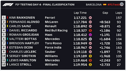 Wat betreft het aantal verreden rondes was Romain Grosjean voor Haas de meest productieve coureur. De Fransman passeerde 181 maal de start-/finishlijn, achttien keer meer dan zijn lansgenoot Esteban Ocon met zijn Force India deed. Ferrari voegde 157 rondjes toe aan haar totaal en had ogenschijnlijk een probleemloze dag, net als de Toro Rosso Honda in handen van Brendon Hartley die 156 rondes op de klok zette.