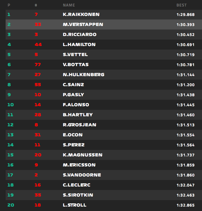 Max Verstappen en Daniel Ricciardo bleven lang binnen staan, maar konden zich aardig meten met de Ferrari’s toen ze eenmaal een run maakten. Max Verstappen stond lange tijd op P4 voor zijn teamgenoot, maar verbeterede zich in de slotfase met een tijd van 1:30.393 op ongeveer een halve seconde achter de snelste man van de sessie. Ook Ricciardo verbeterde zich, maar bleef 0,059 seconde achter de Nederlander steken.