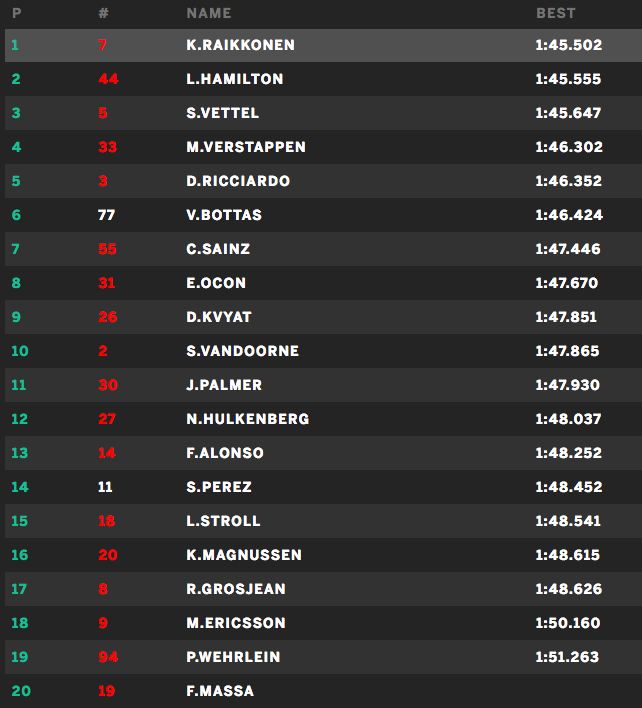 De Fin wist in de laatste vijf minuten een snelle ronde uit zijn Ferrari te persen en zette de voorlopig snelste tijd op 1:45.502. Hij troefde de Mercedes van Hamilton hiermee af met een marge van 0,053 seconde. De Fin noteerde zijn tijd op de ultra zachte banden, terwijl Hamilton op de hardere zachte banden reed.