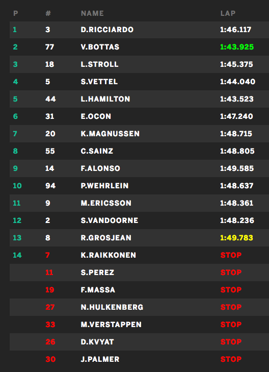 Voor Lance Stroll was het zeker een fantastische dag, de Canadese jongeling reed langdurig op de tweede positie. Op de eindstreep verloor hij echter nog een positie aan de ontketende Bottas, maar legde beslag op een geweldige derde positie voor Williams, terwijl Ricciardo de overwinning opeiste door vooral uit de problemen te blijven.
