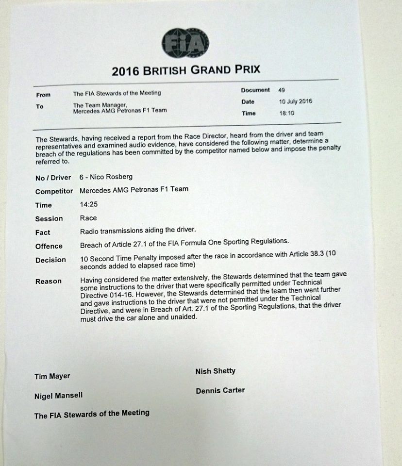 Om 18.10 lokale tijd in Engeland is er een schriftelijke uitspraak door de stewards gedaan in de kwestie rond de ongeoorloofde radiocommunicatie tussen Rosberg en diens team op de pitmuur. Rosberg kreeg te horen een instelling te wijzigen, wat volgens de reglementen niet toegestaan is.