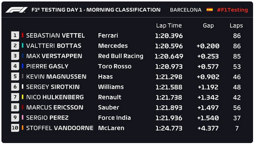 Dinsdagmorgen maakte Red Bull bekend dat niet Daniel Ricciardo, maar Max Verstappen in de auto zou plaatsnemen. Dit in tegenstelling tot de eerder bekendgemaakte planning. Ricciardo moest zich vanmorgen ziek melden en liet daarom het werk vandaag over aan de Nederlander. Verstappen wist de ochtenduren bijzonder nuttig te besteden, hij reed maar liefst 85 rondjes op het circuit van Barcelona en postte daarin de derde beste tijd.