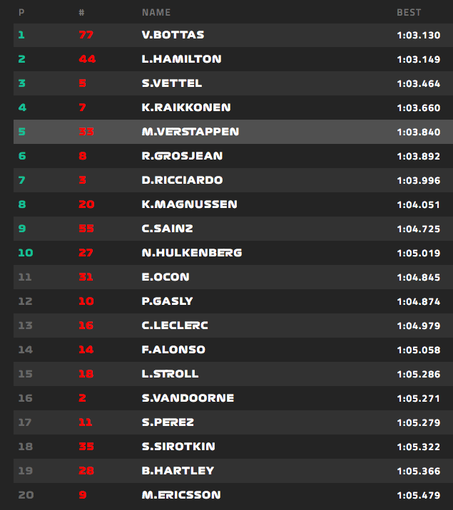 In de kwalificatie voor de Grand Prix van Oostenrijk heeft Valtteri Bottas buiten de snelste tijd van de tijdtraining ook een snelste ronde ooit genoteerd op de Red Bull Ring. De snelle Fin klokte met zijn Mercedes een tijd van 1:03.130 en was daarmee een marginale 0,019 seconde sneller dan Hamilton die naast hem op de eerste startrij zal plaatsnemen. Sebastian Vettel gaf iets meer da 0,3 seconde toe en start van P3.